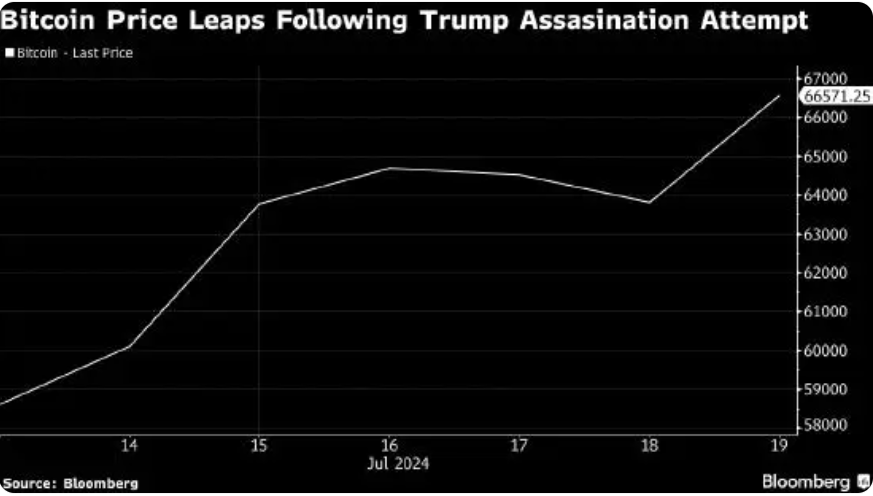 在针对特朗普的刺杀未遂事件发生后,他当选美国总统的概率上升。同期比特币上涨了15%左右。